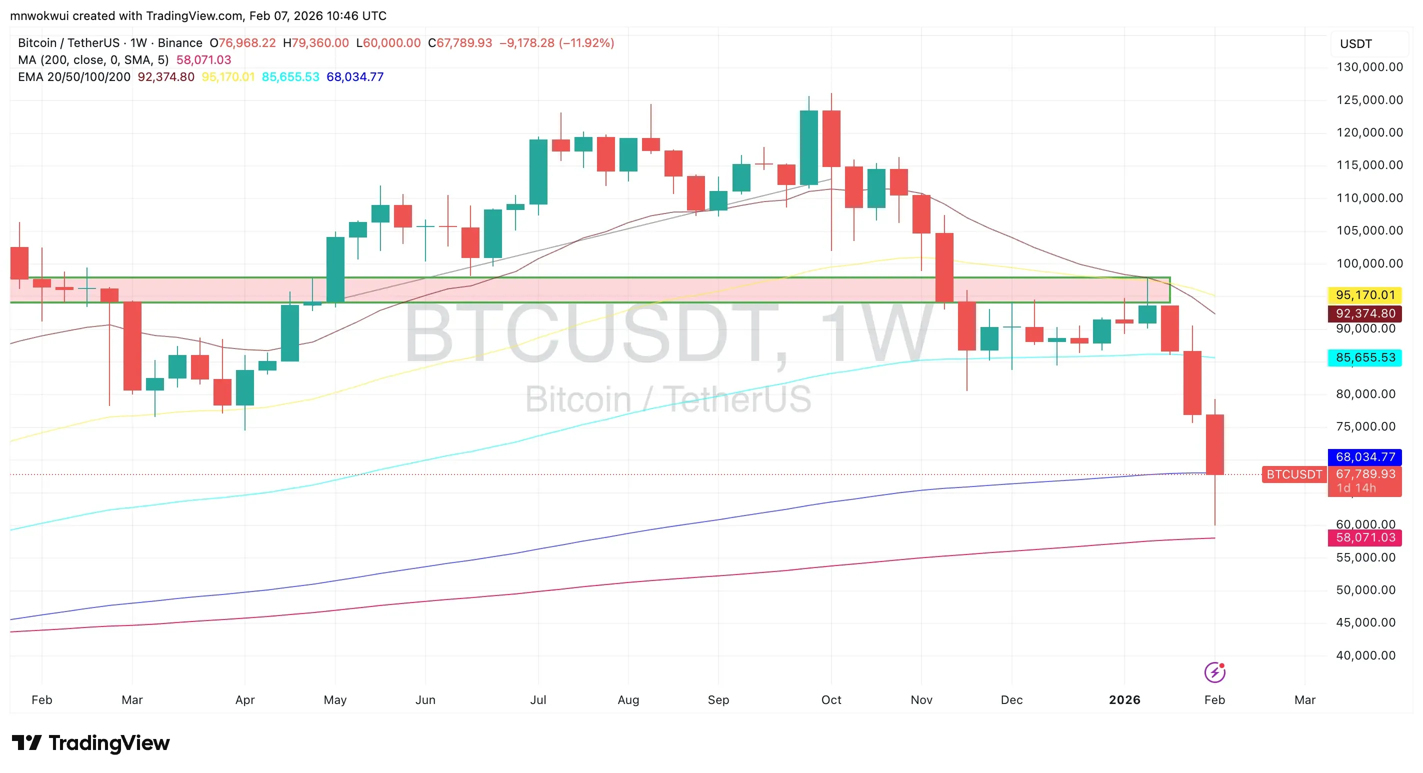 Bitcoin entered 2026 on a relatively constructive note, briefly stabilising after the year-end volatility. However, that optimism faded quickly over the past few weeks as BTC experienced a sharp sell-off, driving price aggressively toward the 200-week moving average around the $58,000–$59,000 region.
