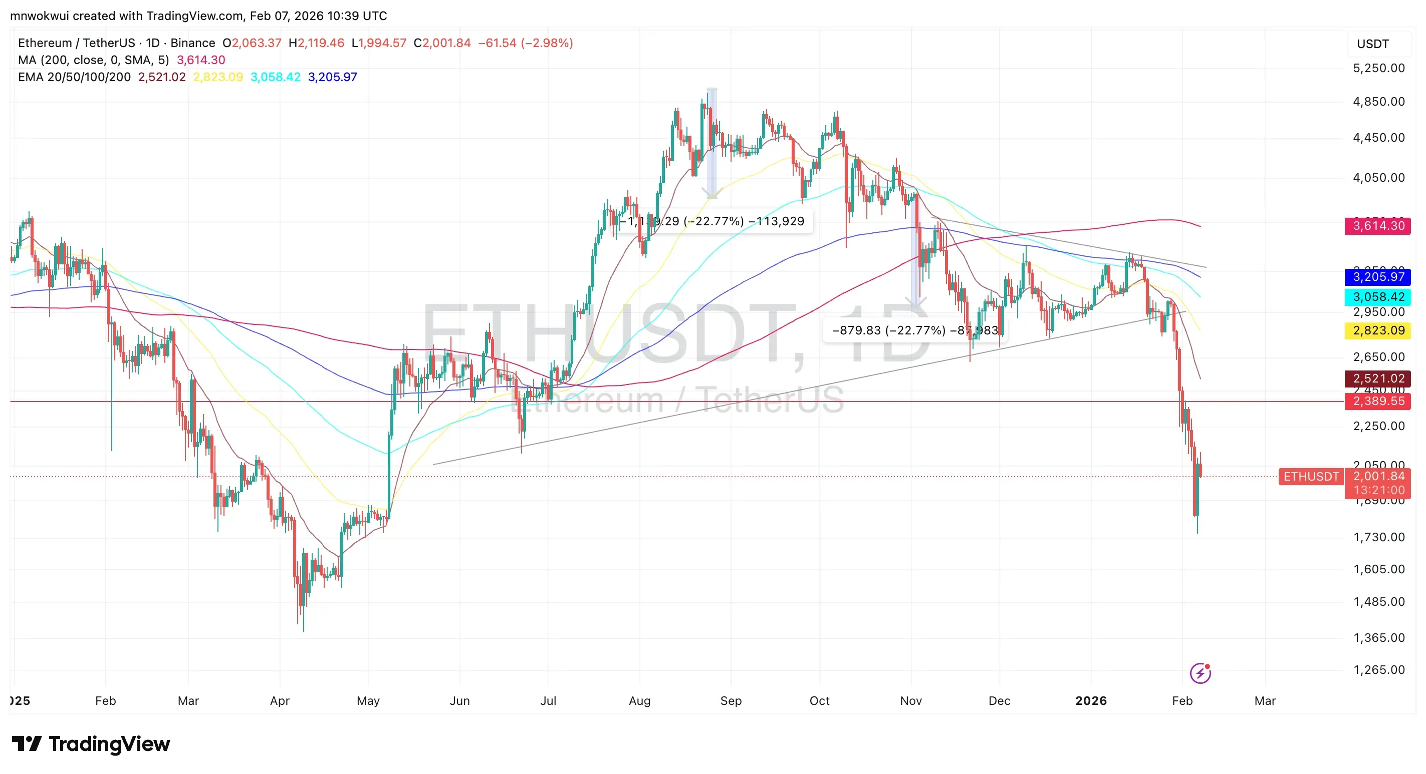 Ethereum has been particularly sensitive to Bitcoin’s downturn. Over the past 20 days, ETH has experienced a steep decline, breaking below multiple moving averages and losing its prior consolidation structure. The recent sell-off pushed price sharply lower, with ETH trading well beneath its 200-day moving average, reflecting a clear shift in medium-term sentiment.