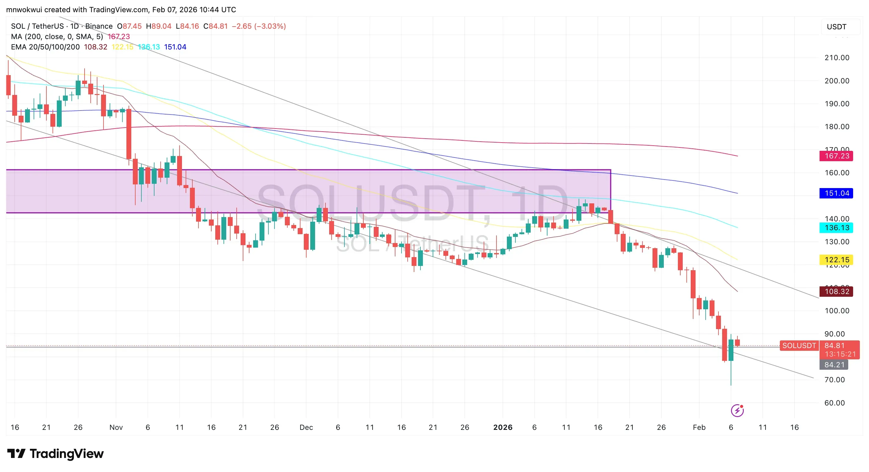 Conversely, the bearish structure remains dominant. Solana continues to trade below its major moving averages, all of which are sloping downward. Without a clear reclaim of these levels, any bounce risks being corrective rather than trend-reversing. A failure to hold current levels could expose SOL to further downside as market participants continue to de-risk.
