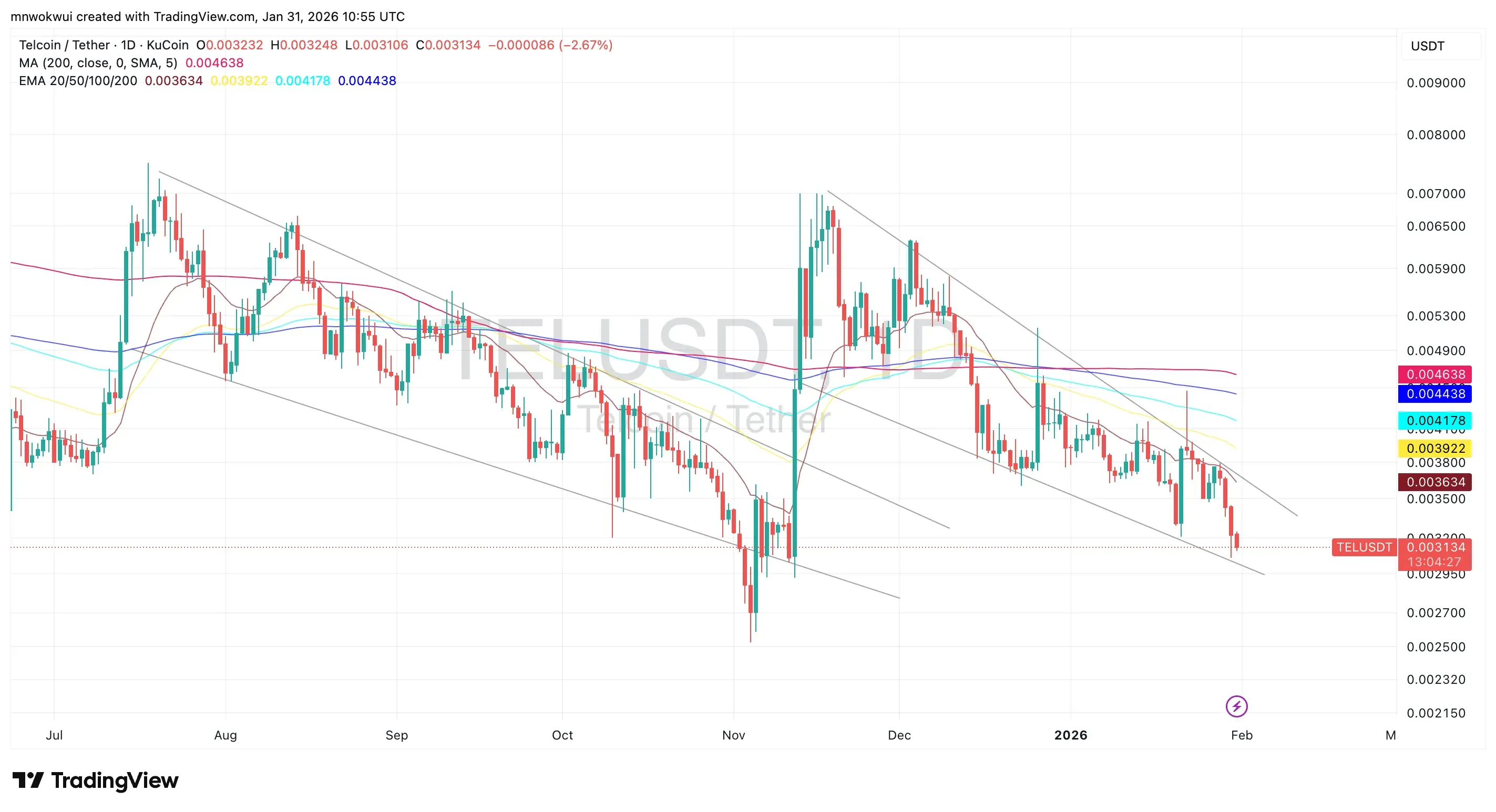 Telcoin (TEL) has moved in near lockstep with Bitcoin’s latest market slump, extending its own multi-week downtrend as risk appetite fades across the crypto market. Since the start of the year, TEL has struggled to sustain any meaningful recovery, with price action reflecting the broader weakness seen in large-cap assets. The result is a chart structure that remains technically fragile, though not without potential turning points.